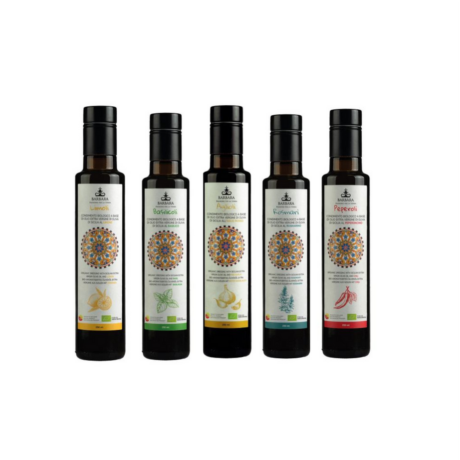 Die Aromaöle von Barbara verbinden hochwertiges natives Olivenöl extra mit natürlichen Aromen aus frischen Kräutern und Früchten. Jede Sorte wird direkt in Sizilien handwerklich hergestellt – ohne künstliche Zusätze, nur mit reinen, kaltgepressten Zutaten. Das Ergebnis: intensive, ehrliche Geschmäcker wie Zitronenöl mit frischer Zitrusnote, Chiliöl mit angenehmer Schärfe, Rosmarinöl mit mediterraner Würze, Basilikumöl mit feinem Duft oder Knoblauchöl mit kräftigem Charakter. Perfekt, um Gerichten das gewisse Etwas zu geben – von Pizza und Pasta bis zu Salaten, Fleisch und Gemüse.
